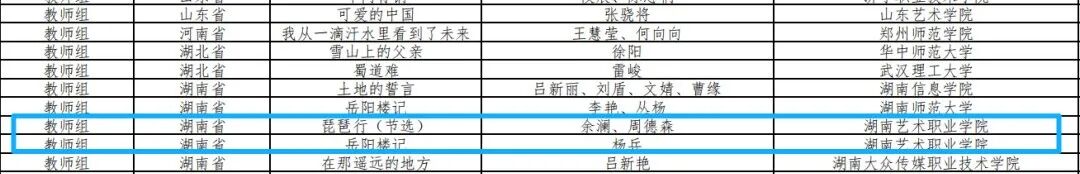 我校选送的杨兵老师《岳阳楼记》(李璐瑜、夏惠慧指导)和余澜、周德森老师《琵琶行(节选)》(林昆山、李丽娜指导)在斩获省赛一等奖、入围全国复赛及决赛的基础上,又闯入全国现场总决赛(最终排名待公布)。此次全国仅有74个教师组作品入围现场总决赛,其中湖南仅5个,我校也是此次全国教师赛道入围作品最多的院校之一,刷新了湖艺在这一国家级专业赛事上的历史最佳成绩。