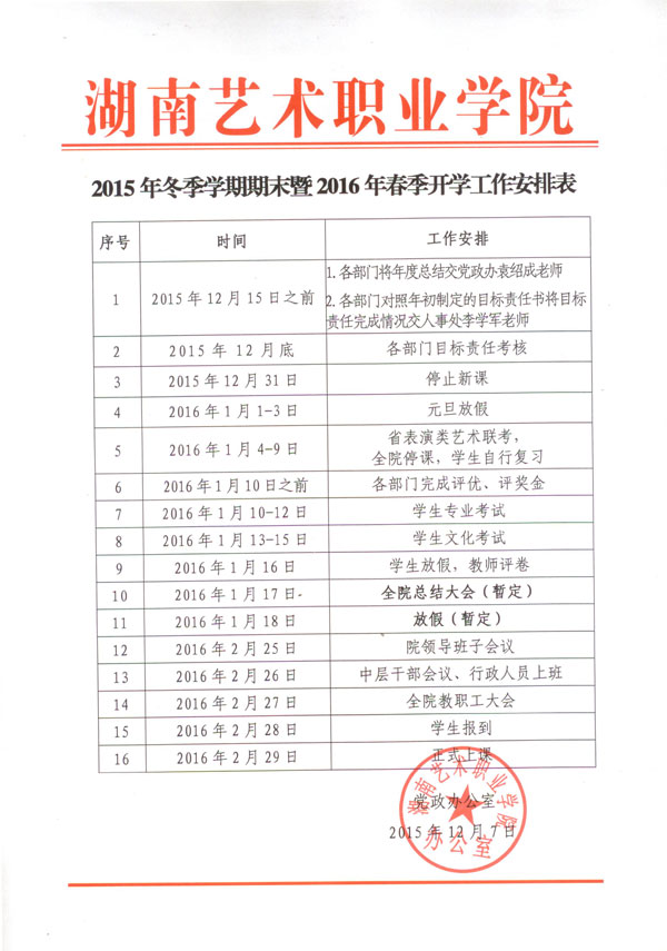 2015年冬季学期期末暨2016年春季开学工作安排表